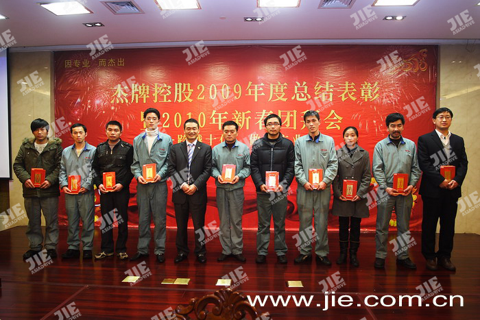 2010年02月10日,杰牌控股2009年度總結表彰暨2010年新春團拜會在蕭山航民賓館隆重舉行,在《杰牌之歌》的歌聲中拉開了杰牌控股2009年度總結表彰會的序幕,會議公布了2009年度“杰牌形象獎、杰牌業績獎、杰牌精英獎”得主。會上董事長&總裁陳德木先生作了2009年度工作報告,和邦咨詢嚴正老師為我們分享了《開創新局面-成就卓越績效,實現人生價值》的主題報告。通過活動,明確了公司2010年目標任務,鼓舞了全體員工的信心和士氣,為公司2010年目標任務的完成奠定了良好的思想基礎??偨Y表彰會后全體員工參加了新春團拜會,抽獎活動和各部門精彩的表演使團拜會掀起一陣陣高潮,最后在全體員工《杰牌之歌》的合唱聲中結束了杰牌控股2010年新春團拜會。